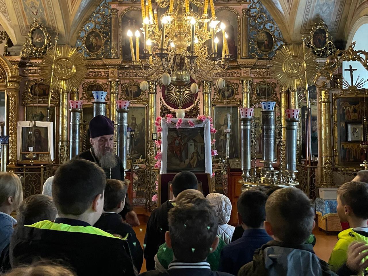 Настоятель храма протоиерей Пётр Дубяго показал детям икону и роспись «Чудо Архистратига Михаила в Хонех». Школьники внимательно разглядывали настенную роспись, а священник объяснял каждую деталь изображения.