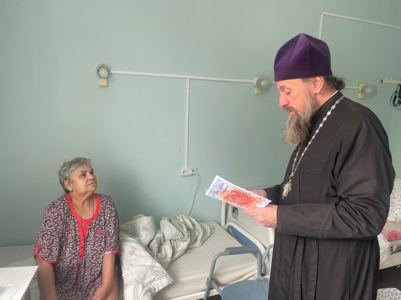Дети подготовили для пациентов отделения 25 поздравительных открыток и корзинку с конфетами. В палатах священник поздравил пожилых людей с праздником, ребята прочитали стихи и вручили подарки.