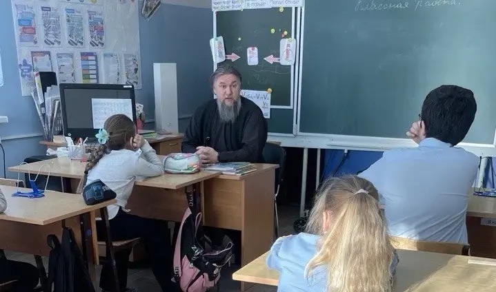 6 февраля в 4 классе школы в Юрьево-Девичье прошел урок ОРЭКС, который провел настоятель Георгиевского храма, протоиерей Александр Азаренков.