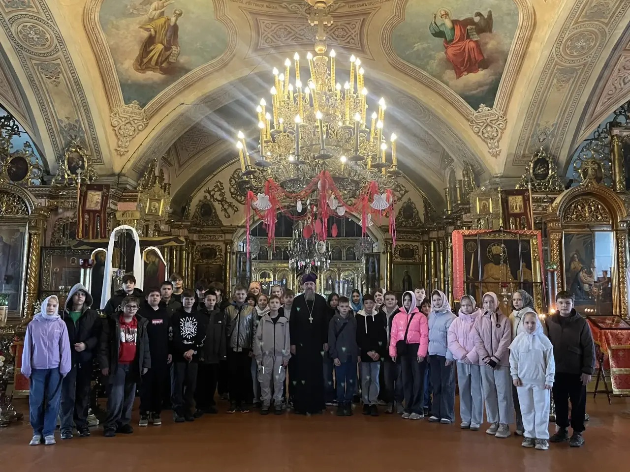 Настоятель прихода протоиерей Пётр Дубяго провёл для ребят экскурсию и познакомил их с историей старинного села. В храмах он обратил внимание школьников на архитектуру и росписи, рассказал об иконах и убранстве.