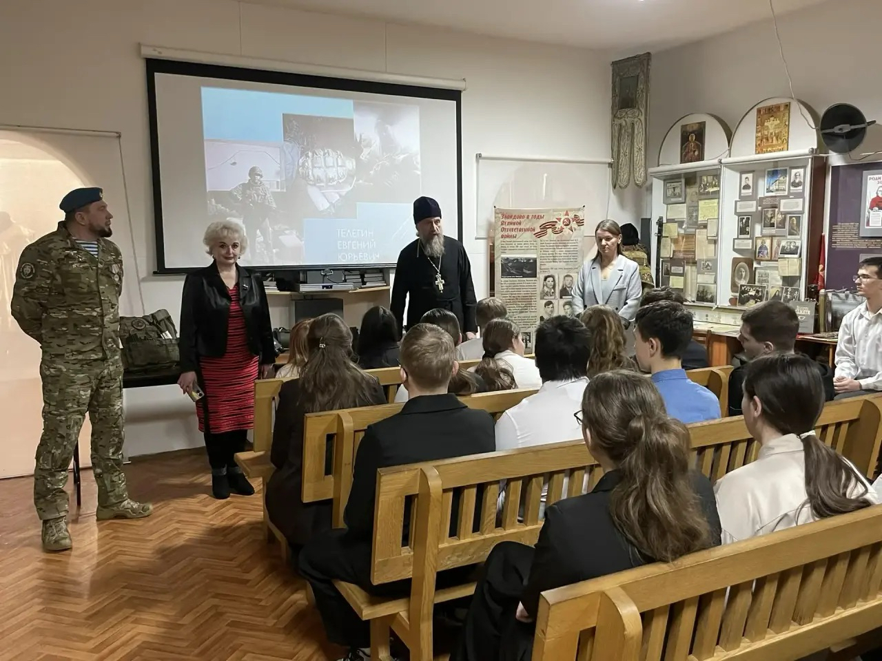 4 февраля в музее «История села Завидово и его храмы» на территории храмового ансамбля с. Завидово прошел «Урок мужества» для учеников 9-11 классов местной школы с участником СВО Евгением Юрьевичем Телегиным.