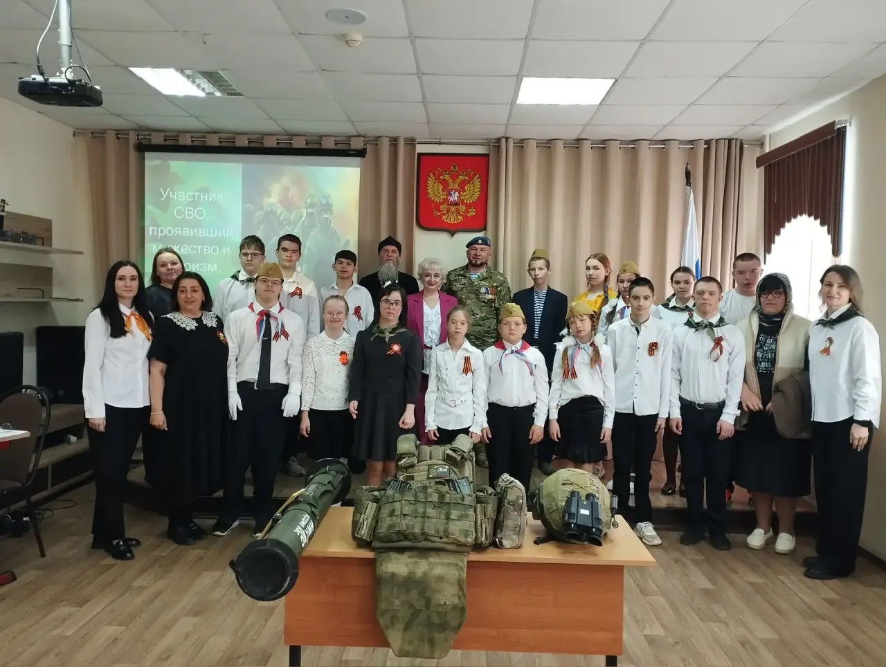 Евгений Телегин принёс с собой элементы экипировки: шлем, бронежилет и реактивную штурмовую гранату (РШГ). Детям дали всё рассмотреть, а желающие смогли примерить шлем и бронежилет. Многие удивились, насколько это тяжело — и, кажется, впервые по-настоящему почувствовали, с какой нагрузкой ежедневно живут солдаты.
