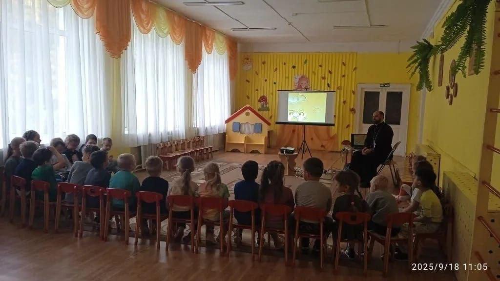 В актовом зале собрались ребята из средней группы. Иерей Александр показал им презентацию — на конкретных примерах объяснял, что такое добро и зло, почему важно радоваться и как не обижать других. Потом все вместе посмотрели знакомый многим мультик «Цветик-семицветик».