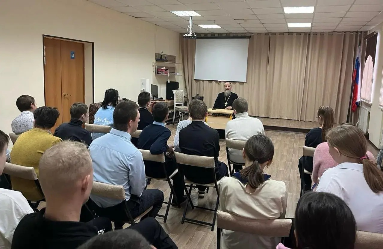 В актовом зале священник рассказал детям о значении праздника. Ветхозаветные праведники, пророк Симеон и Анна, встретились со Спасителем, который заключил с людьми Новый Завет. Церковь ежегодно отмечает Сретение 15 февраля, в этот же день празднуется День православной молодёжи.