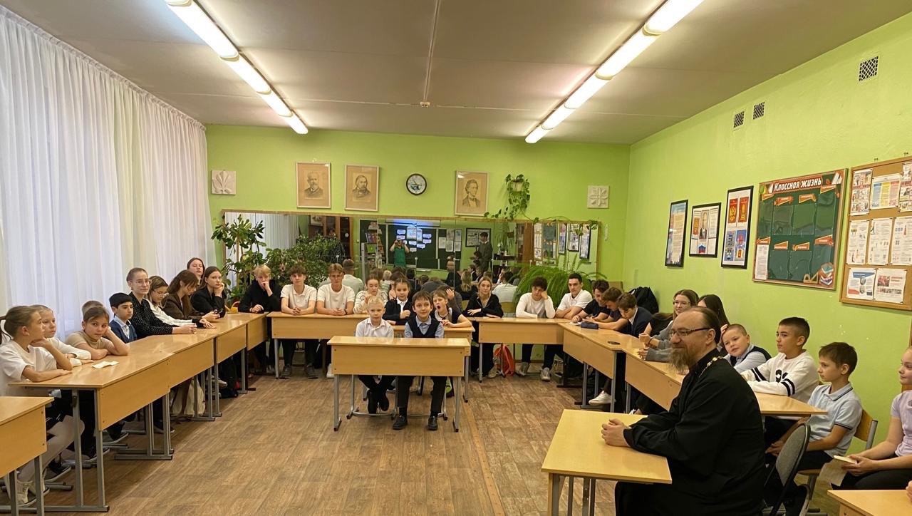Иерей Виктор вместе с учителями и школьниками 5 и 6 классов школы №8 г. Конаково слушали чтения житий святых священномученика Арсения Троицкого, блаженной Ксении Петербургской и стихи о святителе Дмитрие Ростовском, подготовленные учащимися 5 и 10 классов. Дети также узнали о других выдающихся людях России, живших святой жизнью.