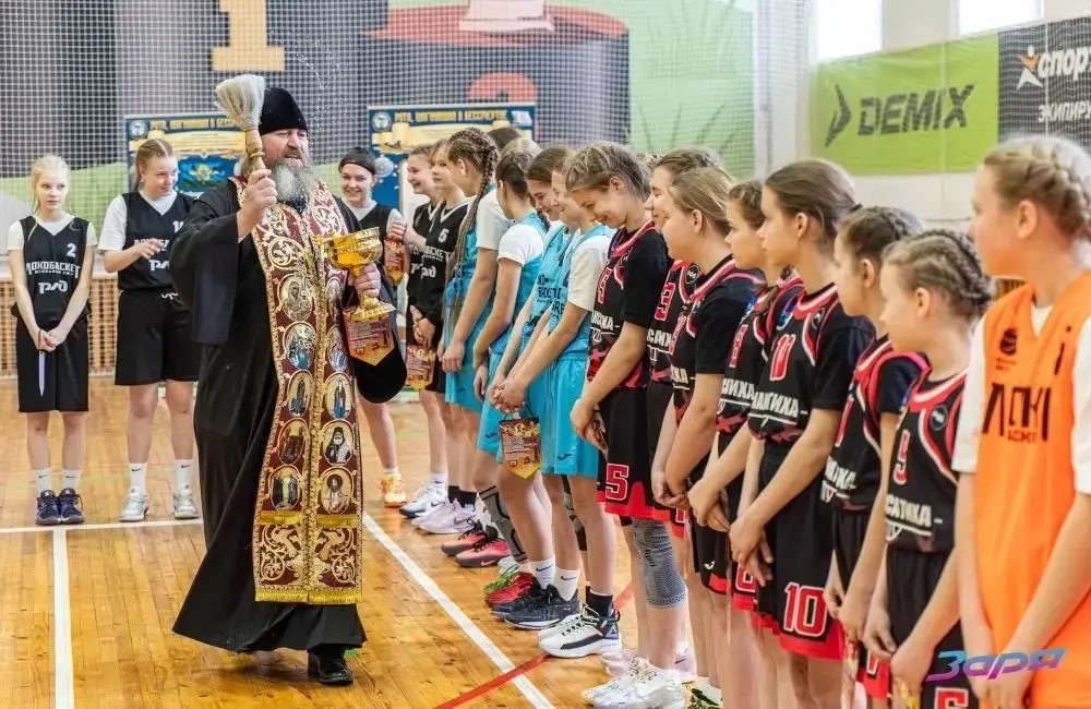 В спортшколе «Олимп» города Конаково турнир по баскетболу памяти Дениса Стребина посетил священник