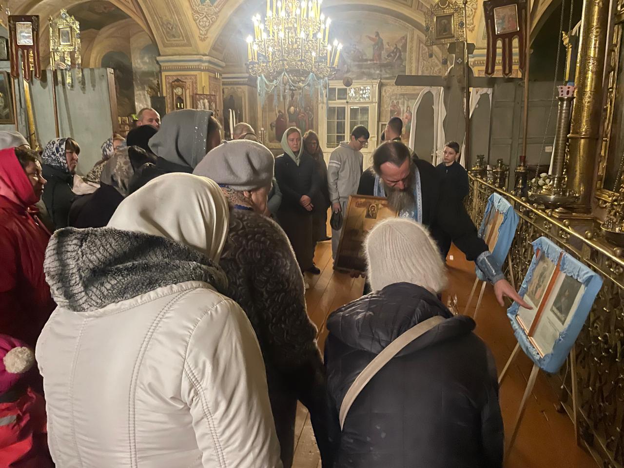После Всенощного протоиерей Пётр пригласил прихожан на выставку, где были представлены 12 списков Казанской иконы. Среди них: